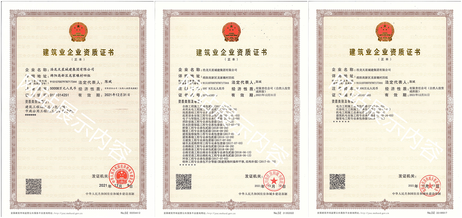 浩龍?zhí)煨浅墙瘓F有限公司,2007年成立于“李白故鄉(xiāng)、中國科技城”—四川省綿陽市,企業(yè)注冊資本金5.0008億元。公司共有27項建筑業(yè)企業(yè)資質(zhì),其中國家一級資質(zhì)11項,二級資質(zhì)10項,三級資質(zhì)5項,特種資質(zhì)不分等級1項,類別涵蓋建筑、市政、水利、機電、隧道、起重設(shè)備安裝等基礎(chǔ)及未來發(fā)展重點專業(yè)。公司...